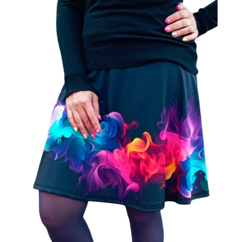 Elegantní, výrazná a naprosto nepřehlédnutelná. Tato půlkolová sukně s unikátním potiskem barevných vln a kouřových efektů Vám dodá sebevědomí a energii na každý den. Zářivé odstíny modré, růžové, fialové a oranžové nádherně vystupují z černého podkladu a vytvářejí efekt, který působí jako živý.